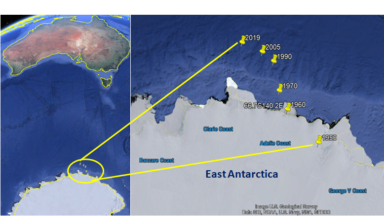 The Figure above, courtesy of http://wdc.kugi.kyoto-u.ac.jp/poles/polesexp.html demonstrates the move of the magnetic pole further east in the southern hemisphere. My research on this site under pages Earth Temperature , Another proof that Low Surface Temperature follows the Magnetic Pole , and Another Proof that the Magnetic Configuration of Earth has Induced and Permanent fields confirm why the ocean to the east of Antarctic is getting colder as the magnetic pole in the southern hemisphere is moving eastward, while the ocean in the west of Antarctic is getting warmer as the magnetic pole is moving away from, and as such breaks the IOD cycle addressed above.