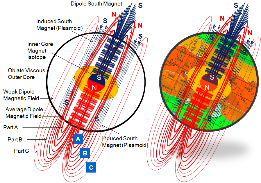 Part A: A relatively strong magnetic field force that peeks, along the rotation axis, through the planet geo-layers to reach its southern polar circle and loops back into the planet geo-layers, in parallel and in close proximity to the rotation axis, to flux out at the northern polar circle. Such magnetic field force peeks again through the planet geo-layer along the rotation axis to close the dipole north-south magnetic circle.