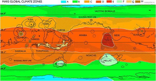 Mars Global Climate Zones, based on temperature, modified by topography, albedo, actual radiation.