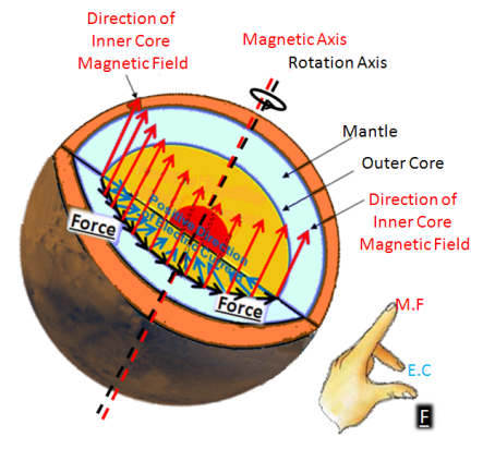 Part B: A mild magnetic field force that peeks, along the rotation axis, through the planet geo-layers to reach its southern polar circle and loops back to the surface of the planet to connect with the ring of patches of induced south magnets (Plasmoids) in the southern hemisphere of Mars causing aurora borealis.