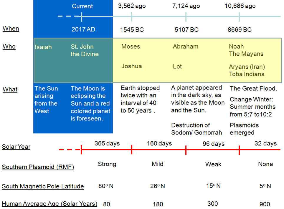 The cycle features vary greatly. Whereas the short cycle is 3,562 years, we do not know for certain what is the number of days per solar year? What is the spin speed of Earth about its axis? What is the location of the magnetic pole, the Temperature Belts and the resultant Climates? Some 10,000 years ago there were no traces of Plasmoids (Reversed Magnetic Field at the Antarctica. This means that the spin speed as explained above was so slow that the electrons flowing in the outer core did not move in spiral paths and accordingly resulted in no induced magnetic field force.